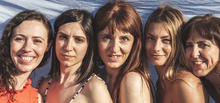 group of multiethnic women with different kind of skin posing together in studio. Concept about body positivity and self acceptance