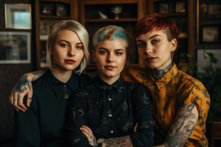 Three young women with tattoos and vivid colors short hair in an office. Generative AI AIG21.