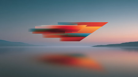 This captivating image features abstract geometric shapes in vibrant colors hovering above calm waters, creating a peaceful and surreal landscape at twilight.