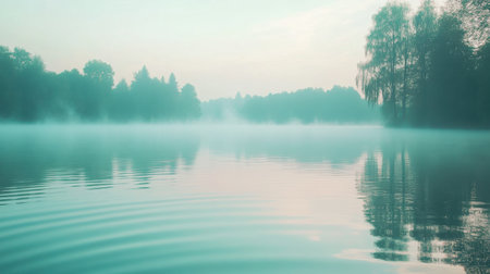 Soft mist blankets the calm lake, creating a peaceful atmosphere as gentle ripples disturb the tranquil water in the early morning.