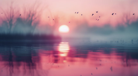 Dawn breaks over a tranquil lake, reflecting soft pink hues. Silhouettes of trees line the shore, while birds soar gracefully across the sky, creating a peaceful atmosphere in the early morning mist.