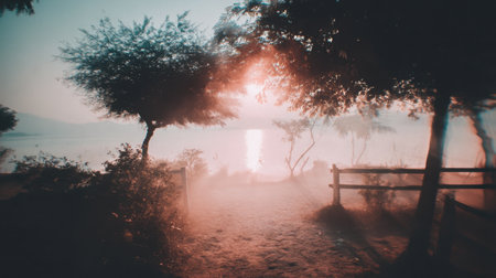 A stunning misty lake landscape featuring a serene atmosphere with trees reflecting on calm water. The early morning light creates a peaceful scene, perfect for nature lovers.