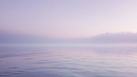 AI Generated. Serene Water Surface with Misty Horizon in Dreamy Lavender Tones