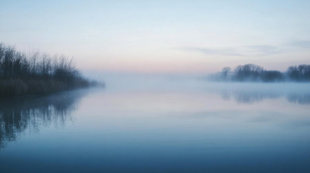 A foggy lake with a blue sky in the background. The water is calm and still. The sky is a mix of blue and pink, creating a serene and peaceful atmosphere