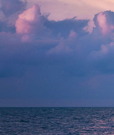 A tranquil and atmospheric coastal scene featuring calm ocean water meeting a dark, rocky shore. The expansive sky with soft clouds creates a serene and peaceful mood.