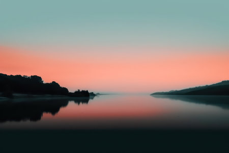 A peaceful dawn scene showcasing a calm lake reflecting surrounding trees, creating a tranquil atmosphere that embodies natural beauty and serenity.