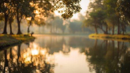 A breathtaking sunrise casts golden hues over a calm lake, creating misty reflections that evoke tranquility and peace in a beautiful natural landscape.