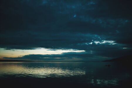 Night sky and sea. The setting sun and calm water. Sunset sky with clouds. Dark ocean water.