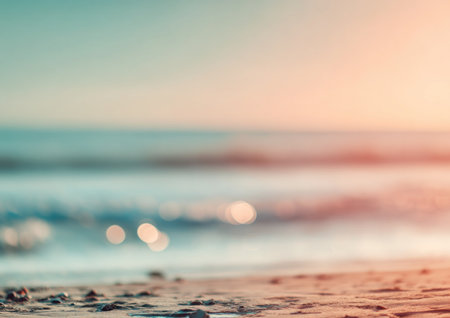 A blurred beach scene showcases the soft focus of waves and a warm sunrise over the ocean