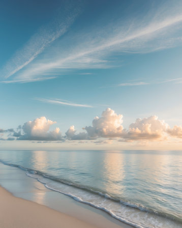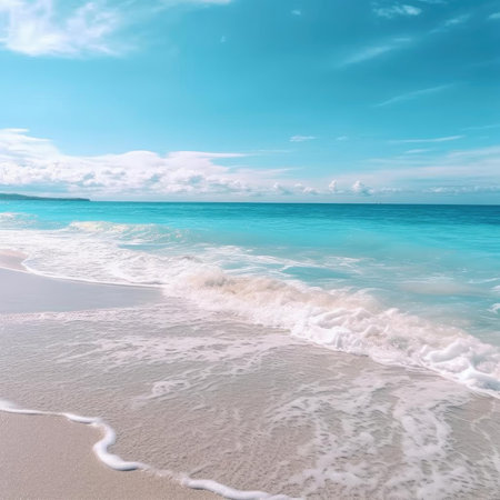A serene landscape featuring a coastal beach with crystal clear water, waves gently rolling in under a sunny sky dotted with fluffy clouds, creating a picturesque horizon AIG50
