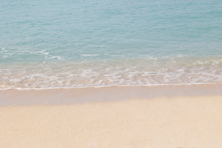 Soft ocean wave gently rolling on the sandy beach during a beautiful golden sunset, creating a peaceful and serene atmosphere