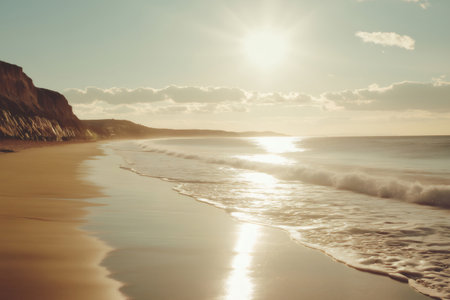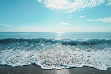 Beautiful ocean waves gently rolling onto a sandy shore, creating a serene coastal scene perfect for relaxation and tranquility during golden hour.