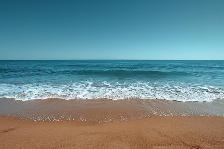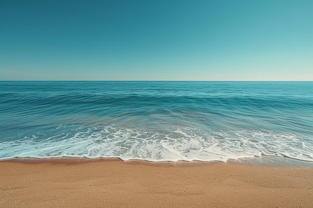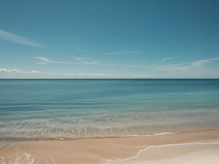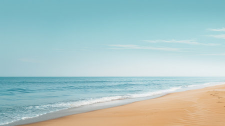 A serene seascape featuring a calm ocean with soft waves breaking on a golden sandy beach, under a vast, clear blue sky.