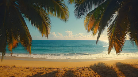 Vibrant beach scene, palm trees, golden sand, azure water, idyllic vacation imagery, website, travel brochure, advertisement.