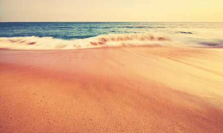 Tropical sandy beach with motion blurred waves at sunset, focus on foreground, color toning applied