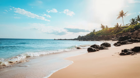 A peaceful beach scene featuring soft golden sand leading to a clear blue ocean under a sunny sky, perfect for relaxation and vacation vibes.