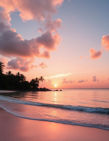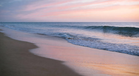 Experience the calm beauty of ocean waves rolling onto a sandy beach at sunrise, creating a serene and tranquil atmosphere in this picturesque coastal landscape.