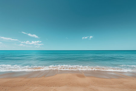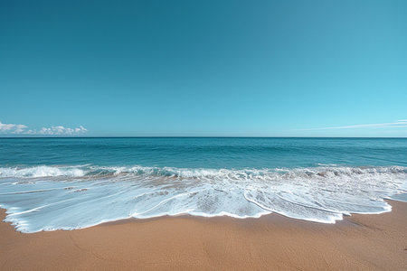 A tranquil beach scene with calm turquoise ocean waves washing ashore on a golden sand beach, under a vast blue sky.