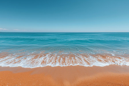 Beautiful turquoise ocean waves crash onto a golden sandy beach, creating a peaceful and idyllic coastal landscape under a clear blue sky.