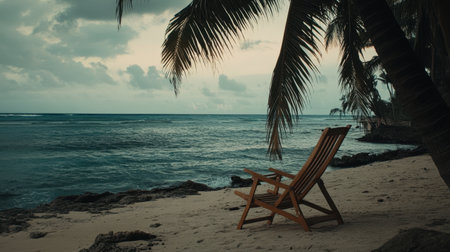 A tranquil beach scene featuring a wooden chair facing gentle ocean waves under an overcast sky, offering a peaceful getaway in a tropical paradise.