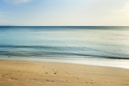Serene seascape featuring the calm ocean horizon, clear sky, and gentle waves meeting a warm sandy beach.