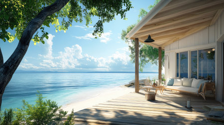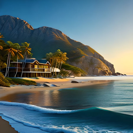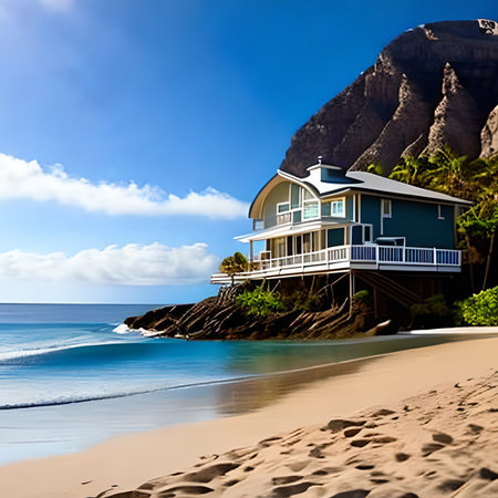 A quaint beach house surrounded by nature and ocean waves, ideal for relaxation. AI generated image
