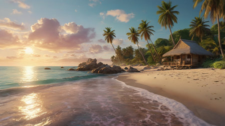 tropical beach with bungalow at sunset - 3d render