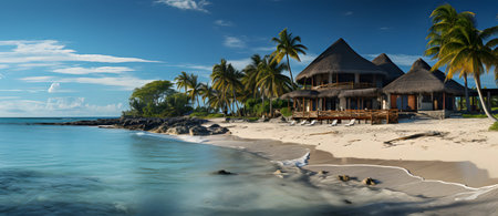 Panoramic view of tropical beach with palm trees and bungalows