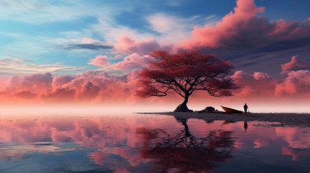 Beautiful sunset over the lake with a tree reflected in the water