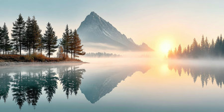 Misty Mountain Lake at Sunrise with Pine Trees
