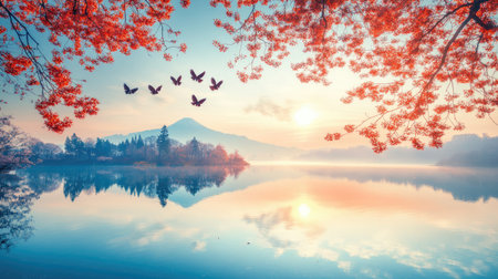 A beautiful sunrise casts vibrant colors across a calm lake, where flocks of birds soar gracefully above the shimmering water, creating a serene and peaceful atmosphere.
