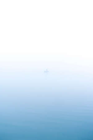 Angler standing in boat surrounded by morning mist