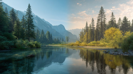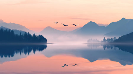 A serene mountain lake at dawn background with calm waters, rising mist, and the textures of rugged peaks and tranquil reflections, creating a peaceful and majestic natural scene.
