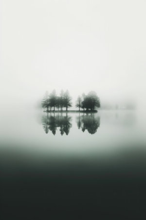 Misty Reflections. Reflection of trees in a lake in foggy weather.