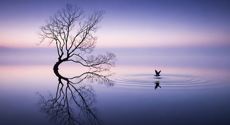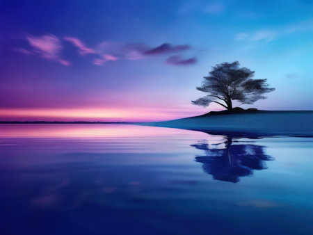 A solitary trees reflection in calm waters under a stunning twilight sky