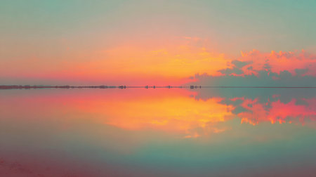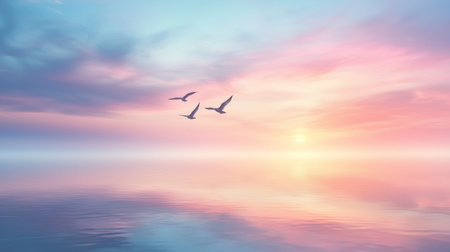 A serene sunset over calm waters with birds flying in sky, creating peaceful atmosphere. soft pastel colors reflect beautifully on water surface
