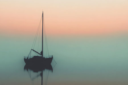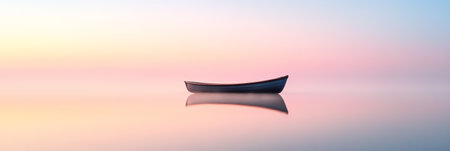 A solitary sailboat rests quietly on still waters during the early dawn, surrounded by a soft palette of pastel colors. The calm atmosphere reflects the peaceful nature of the scene, inviting contemplation and tranquility.