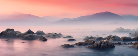 A beautiful sunset over a lake with a foggy mist in the air. The sky is a mix of orange and pink hues, creating a serene and peaceful atmosphere. The water is calm and still