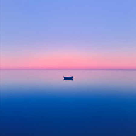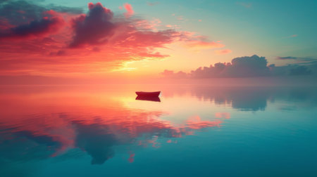 Small wooden boat floating on perfectly still water during a colorful sunset, reflecting on the water surface creating a peaceful and serene atmosphere