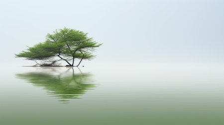 Solitary tree on a small island in a misty lake surrounded by mountains, symbolizing peace, solitude, and the beauty of nature.
