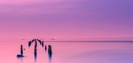 Baltic sea after the rain at sunset. Dramatic sky with glowing pink clouds, symmetry reflections in the water. Abstract natural pattern, texture, background, concept art