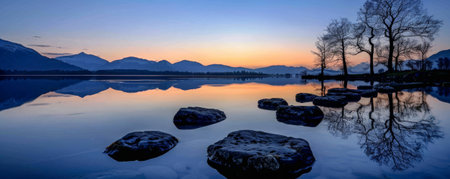 A serene evening lake background with still waters reflecting the twilight sky, silhouetted trees, and the textures of smooth stones and soft ripples, creating a peaceful and calming scene.