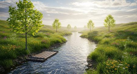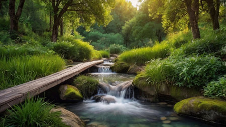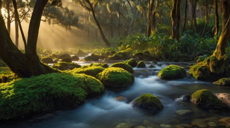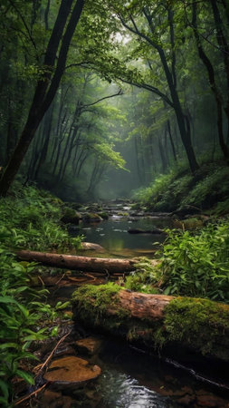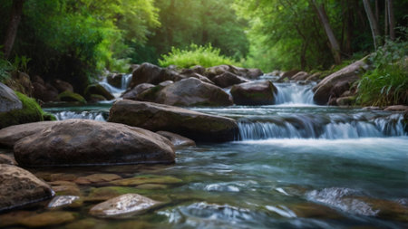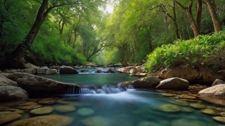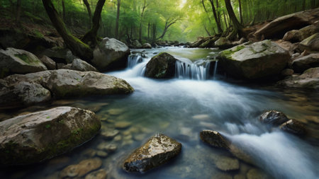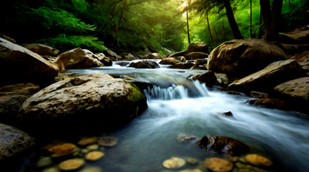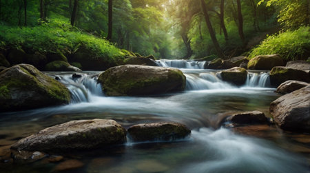 Serene summer landscape stream flowing through mossy stones and lush green forest trees