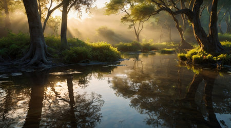 Serene summer forest scene featuring a stream, mossy stones, and play of sunlight and shadows