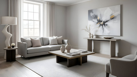 Interior of a modern bright living room with painting on the wall, small table and cozy sofa