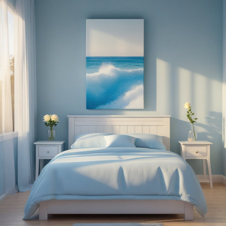 modern bedroom with blue walls, wooden floor, white bed with blue linen and window with sea view