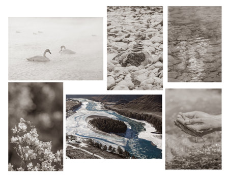 Collage of landscapes with mountain rivers, wild nature and clear water, ready-made tourist postcard
