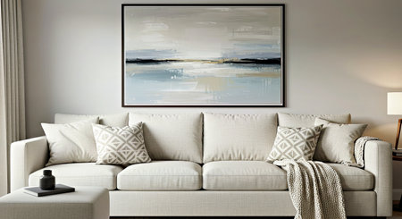 Comfortable Modern Living Room Featuring Cream Sofas Abstract Wall Art and Neutral Decor Style