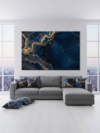 Contemporary stylish room with gray couch, blue abstract artwork, coffee table, square molding and decorative pillows