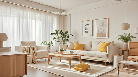 Stylish summer living area with beach view and natural light, 3D render illustration